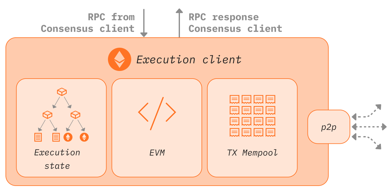 - The execution layer executes the transactions and validates the state in the block header (i.e. checks hashes match)